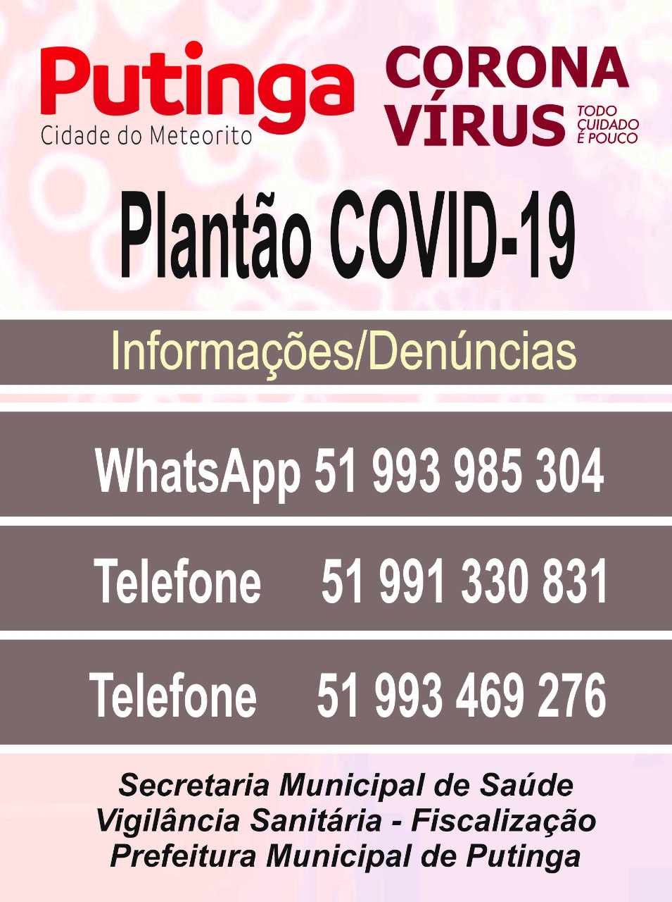 A Secretaria Municipal de Saúde de Putinga e Vigilância Sanitária, estão divulgando números de telefones de plantão para informações e denúncias, referente assuntos ligados ao CORONAVÍRUS. Observando, que as pessoas que sentirem algum sintoma e precisem receber orientações adequadas, devem entrar em contato pelos telefones divulgados. Pedimos que os contatos, sejam feitos somente em caso de necessidade. Disponibilizamos uma equipe para auxiliar em qualquer situação, relacionada a pandemia. Estamos trabalhando para manter a saúde do povo putinguense.