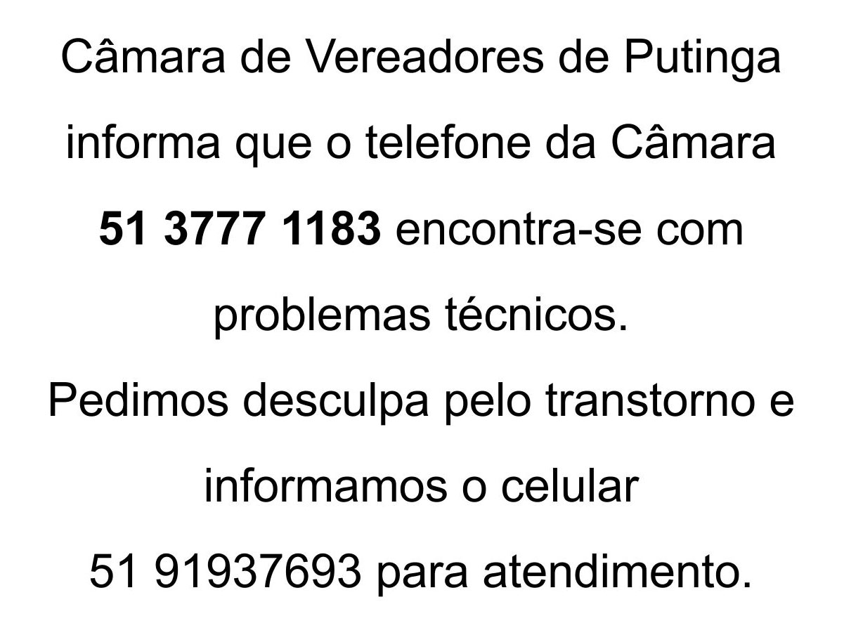 Câmara de Vereadores de Putinga informa que o telefone convencional encontra-se com problemas técnicos. Pedimos desculpas pelo transtorno e informamos o celular 51 91937693 para atendimento.