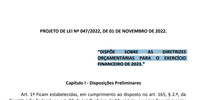 O Projeto dispõe sobre as Diretrizes Orçamentárias para o exercício financeiro de 2023. Após a aprovação da LDO o Poder Executivo realiza o Projeto de Lei do orçamento para o ano de 2023.