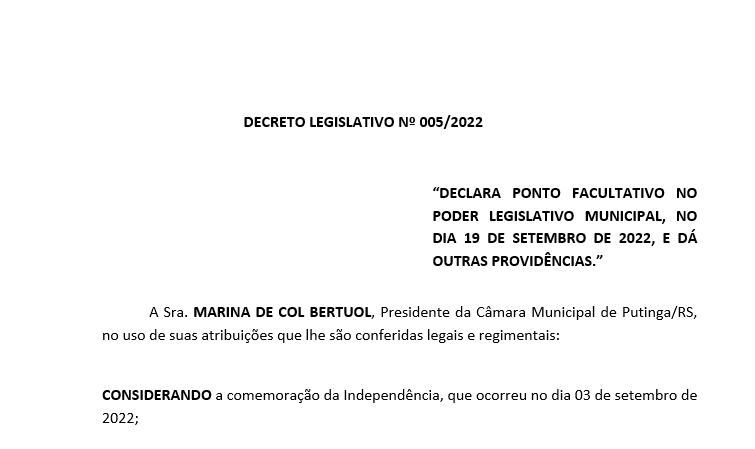 Por meio do Decreto 005/2022, o Legislativo de Putinga declara ponto facultativo na Câmara de Vereadores, na segunda-feira, 19 de setembro, considerando a comemoração da Independência, que ocorreu no dia 03 de setembro; considerando que as escolas estaduais e municipais farão ponto facultativo neste dia, conforme previsto no calendário escolar; e considerando que o prefeito, através do Decreto 2.416/2022, também declarou ponto facultativo em toda a Administração Pública Municipal.