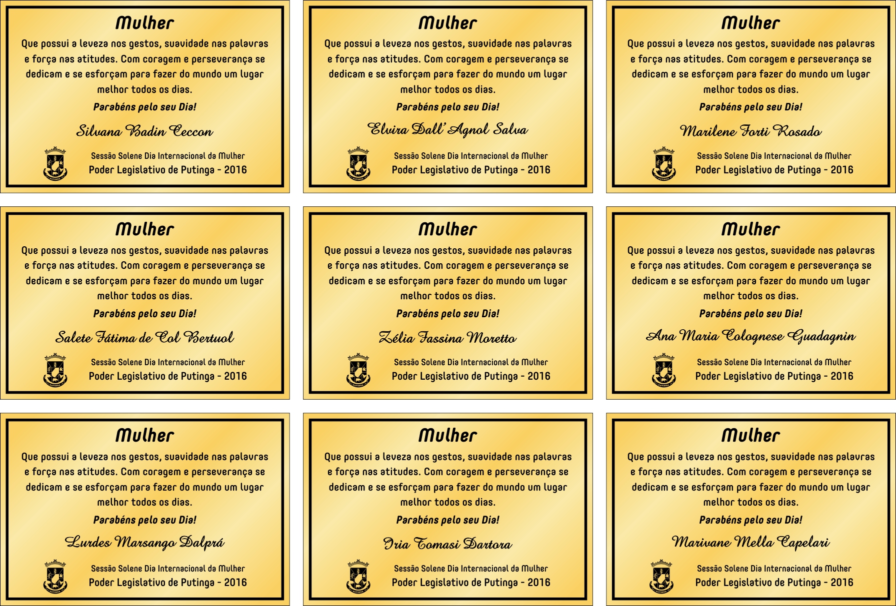 As demais homenageadas serão: Vereador Josmairo Marostica irá homenagear Euvira D. Salva Alduir Strapasson irá homenagear Silvana B. Seccon. Paulo Lima irá homenagear Zélia Fassina Moretto. Rogério Dallacua irá homenagear Marivane M Cappellari. Edson Arosi irá homenagear Iria T. Dartora e Ledia Marca irá homenagear Lurdes Marsango Dalprá.